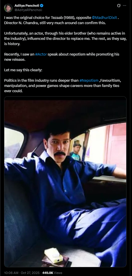 दरअसल, आदित्य पंचोली ने X पर एक पोस्ट शेयर किया, जिसमें उन्होंने अनिल कपूर और बॉनी कपूर पर बिना नाम लिए निशाना साधा। उन्होंने लिखा, मैं तेजाब में माधुरी दीक्षित के साथ लीड रोल के लिए चुना गया था। डायरेक्टर एन. चंद्रा इसकी पुष्टि कर सकते हैं। बदकिस्मती रही कि एक एक्टर ने अपने बड़े भाई के साथ मिलकर डायरेक्टर के फैसले को बदला और मुझे रिप्लेस कर दिया। बाकी जो है, वह इतिहास है।